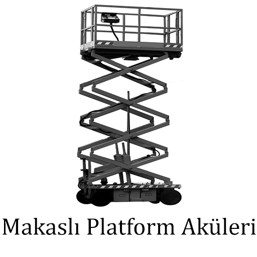 Binicili makaslı platformlarda kullanılan yüksek akımlara karşı güçlü 12V 6V'luk akü grupları. Operasyona göre kuru veya lityum akü tercih edilebilir.